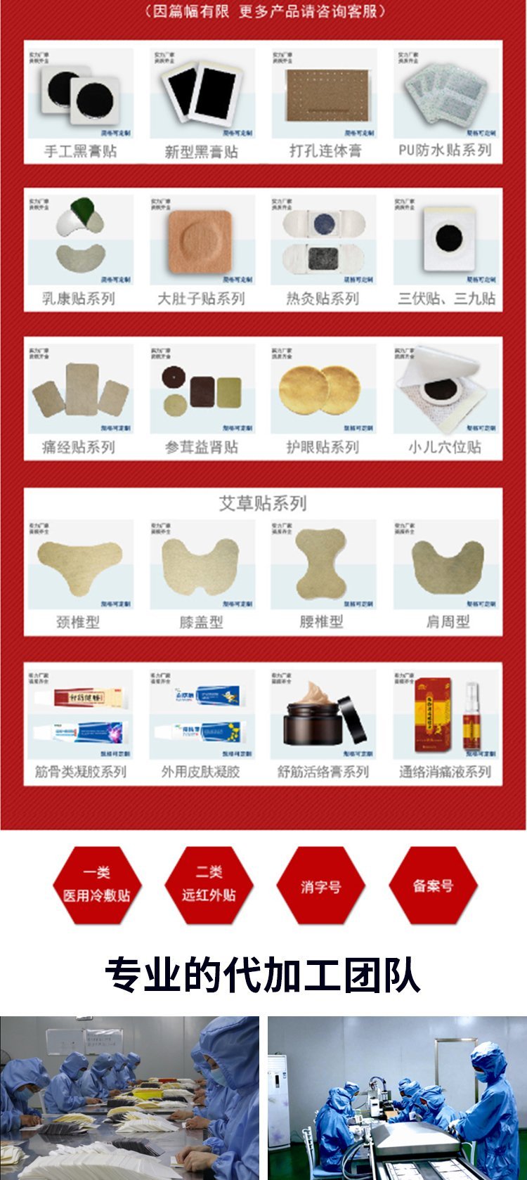 儿童药泥贴新颖品种,文号正规齐全oem贴牌定制!自营产品招商代理。一类二类械字号!医保报销!全国独家专利!穴位贴敷治疗贴贴片(感冒、咳嗽、腹泻、退热、健胃积食、支气管等品种齐全,支持代工)膏药贴片(颈椎?腰椎?关节及身体各部位疼痛)医用冷敷贴(润目医用冷敷贴,鼻康、耳康、妇康、乳康、肤康医用冷敷贴等)医用冷敷凝胶(妇科凝胶,前列腺凝胶,筋骨医用冷敷凝胶,痔疮膏,妇科臭氧油,壳聚糖妇科凝胶等),。产品可走医院挂靠医保收费项目,全国多地区中标挂网成功,医疗器械文号,可在医院操作,欢迎代理商来电咨询。?