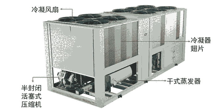 相对于螺杆式冷水机组,活塞式冷水机组,压缩机为活塞运动方式,由制冷压缩机与冷凝器、蒸发器、热力膨胀阀等组装而成,