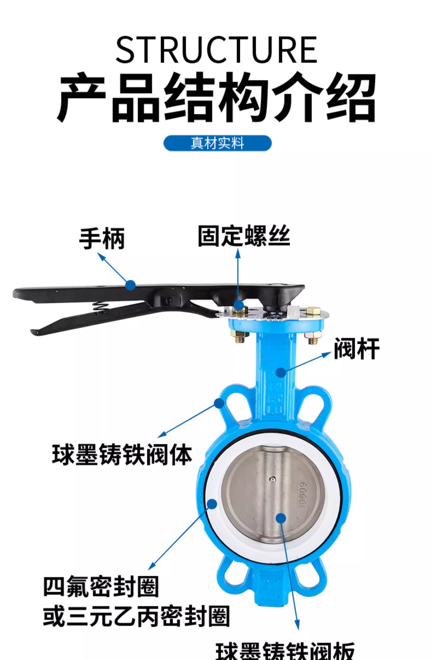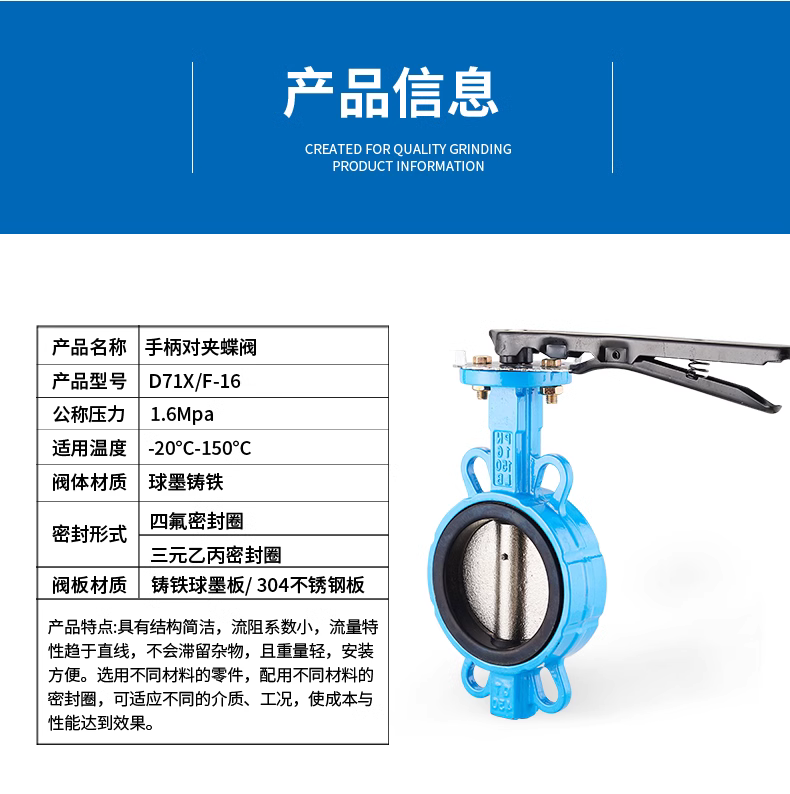 良工阀门D71X-16手动手柄蝶阀对夹球墨铸铁304四氟不锈钢板
