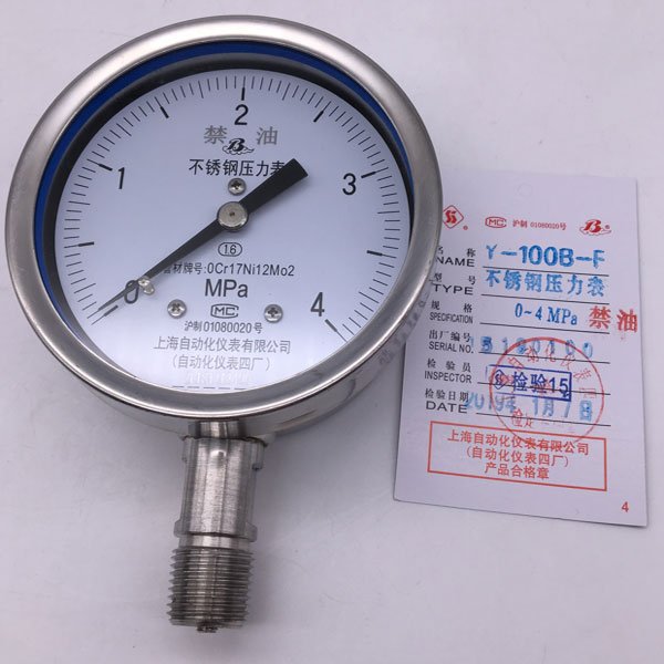 上仪自动化仪表四厂不锈钢禁油压力表Y-100BF0-2.5MPA精度1.6级