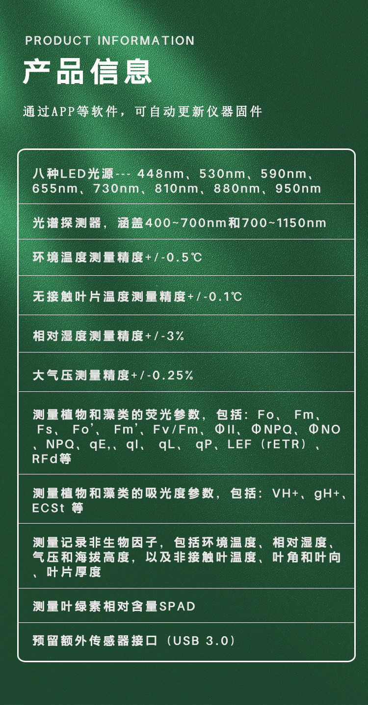 测量指标 | 叶绿素、Fo、 Fm、 Fs、 Fo’、 Fm’、Fv/Fm、ΦII、ΦNPQ、ΦNO、NPQ、qE | ||
