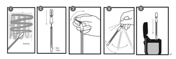 注意:使用前请避光冷藏保存。如果提取样品的表面是干燥的,请将棉签头蘸下纯净水或者蒸馏水,以保证更有效的提取样品,检测时仪器请竖着测试,否则检测结果很有可能为零!