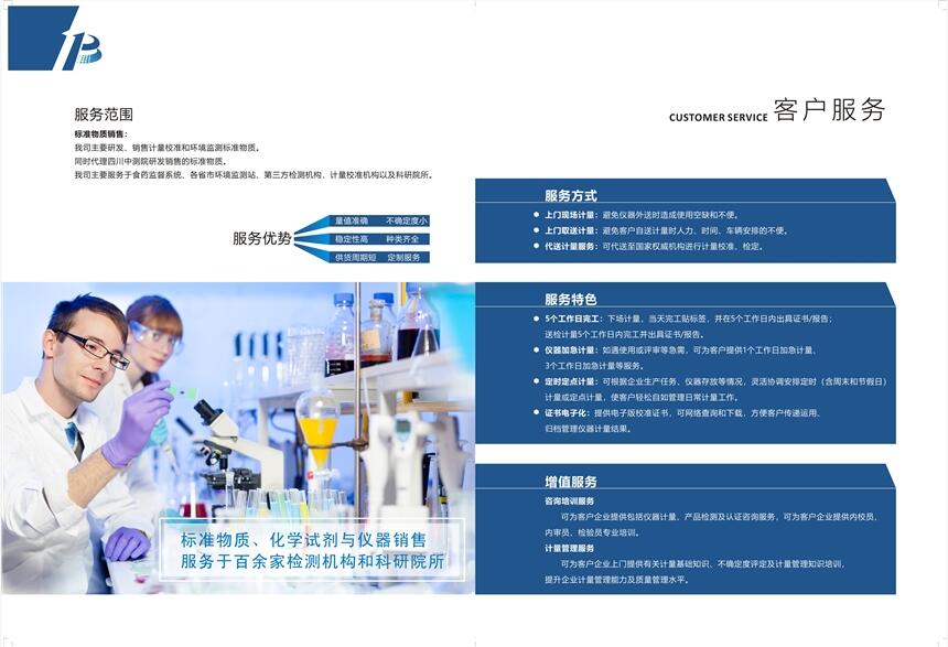 除以上主业外,近年来应公司发展及客户需求,公司还拓展了仪器与化学试剂等的销售业务,并已与多家试剂和仪器品牌生产厂家建立了密切合作关系,长期服务于百余家高校、科研院所。公司本着“公正、科学、准确、诚信”的质量方针,坚持以科学的管理方式,雄厚的技术力量,高效的服务网络、良好的社会关系以及全面的业务范围和创新机制,适应市场发展,为客户提供专业化和高效的校准、检测、培训等计量服务,食品安全检测服务以及标物、试剂、仪器销售服务。