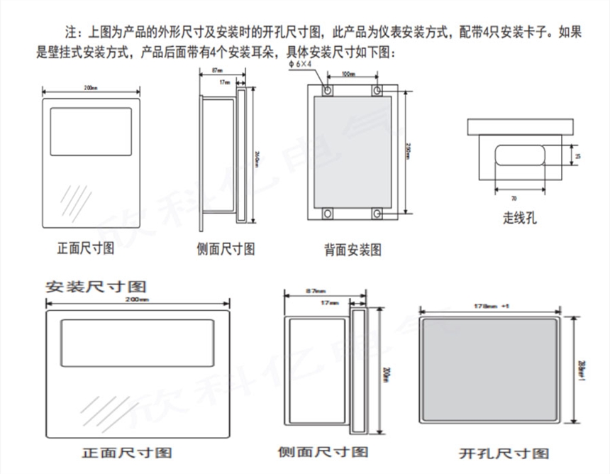 11.设备外型尺寸 200*260*90mm,嵌装开孔尺寸:235*183mm