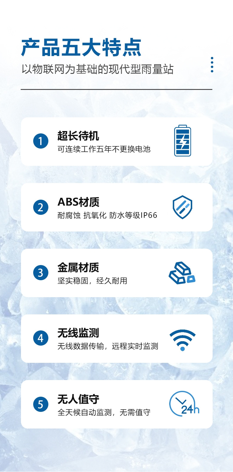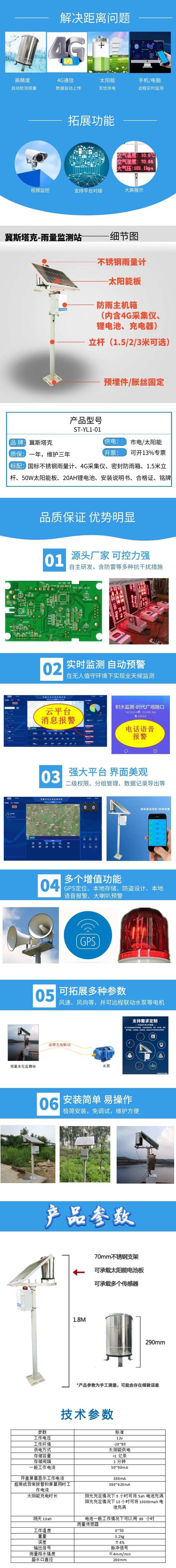 产品用途:雨量在线监测站广泛用于农业、林业、野外、森林防火、山洪监测、雨水研究、气象等部门。可在无人值守的恶劣环境下实现全天候、长期连续在线监测。此外,全自动雨量监测站配套的软件系统可以根据设定的阈值向相关管理单位发布预警信息,以便于相关管理部门及时地做出分析和决策。
