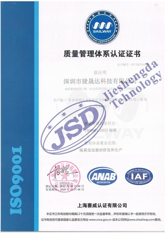 隔离变送器是一种特殊测量的厚膜集成电路或集成的放大电路,该电路的输入信号,输出信号与工作电源电路之间没有直接电路耦合,无论是工作电源还是输入输出信号在传输时都没有公共的接地端,这样使该设备在工作时能够保护输入,输出设备的安全运行,有效的抑制空间电磁干扰及各种天体干扰,保护设备不被损坏。捷晟达科技的JSD TA-1001-D11是输入输出三隔离的,广泛用于工业自动化控制系统。