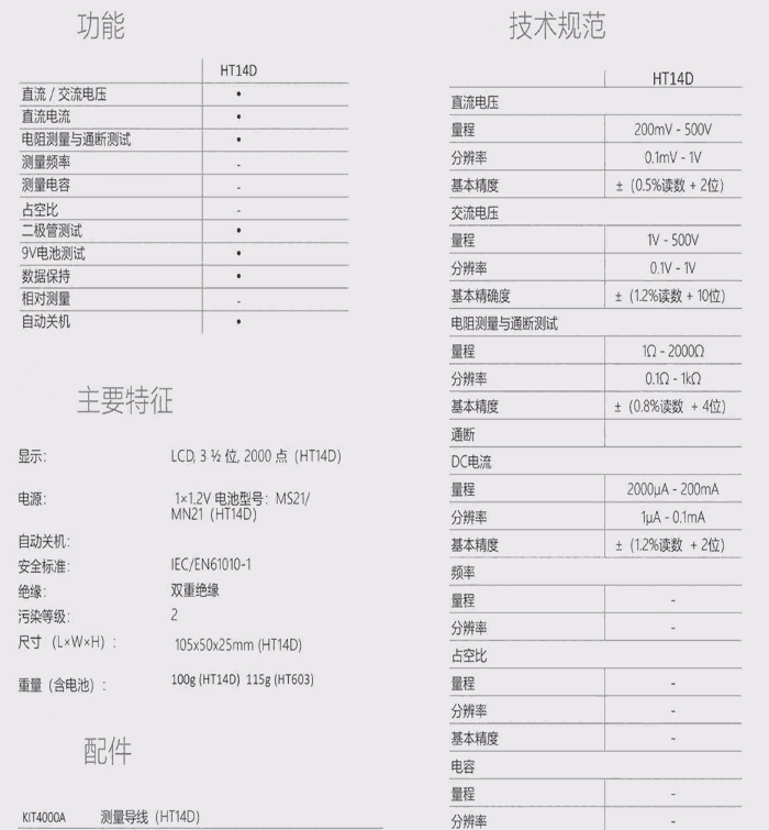 H T 1 4 D 是一款紧凑型数字万用表,主要测量500V的交/直流电压、200mA的直流电流,执行电阻测量、二极管测试、9V碱性电池检测等功能。设备根据IEC/EN61010-1安全标准设计,CAT III3 0 0 V双重保护绝缘。H T 1 4 D具有宽阔的LCD显示屏,可以通过相关开关选择各项功能。该设备的另一项功能是数据保持功能,将数据冻结在显示屏上