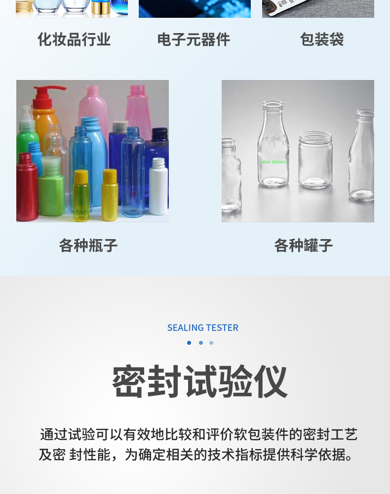 适用于食品、制药、日化、电子等行业软包装件的密封试验。通过试验可以有效地比较和评价软包装件的密封工艺及 密封性能,为确定相关的技术指标提供科学依据。亦可进行经跌落、耐压试验后的试件的密封性能测试