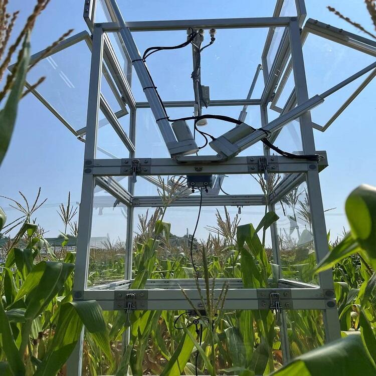 土壤透明呼吸叶室是双循环土壤呼吸观察系统的重要组成部分,采用亚克力板材质,透光率93%,在亚克力板上贴锡纸,可实现暗室效果。可控自动旋转开合(上窗90°,侧窗45°)采用特制电动推杆进行压合密封,持续性与耐候性强,混气风扇能够快速混匀叶室内气体,加快测试进程。