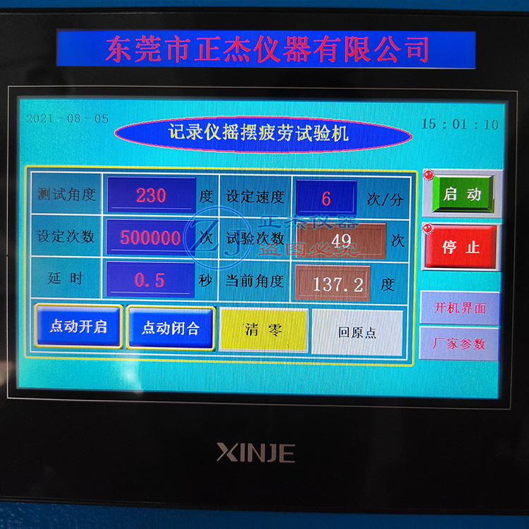 本机是模拟摇摆的样品按一定的速度、一定的角度反复弯折摇摆到一定的次数后,查看样品的损坏情况;本机采用PLC触摸屏程序控制,能显示测试的角度、速度、次数并可设置调节,精度高,噪音小,操作简单,使用方便,安全稳定准确耐用;