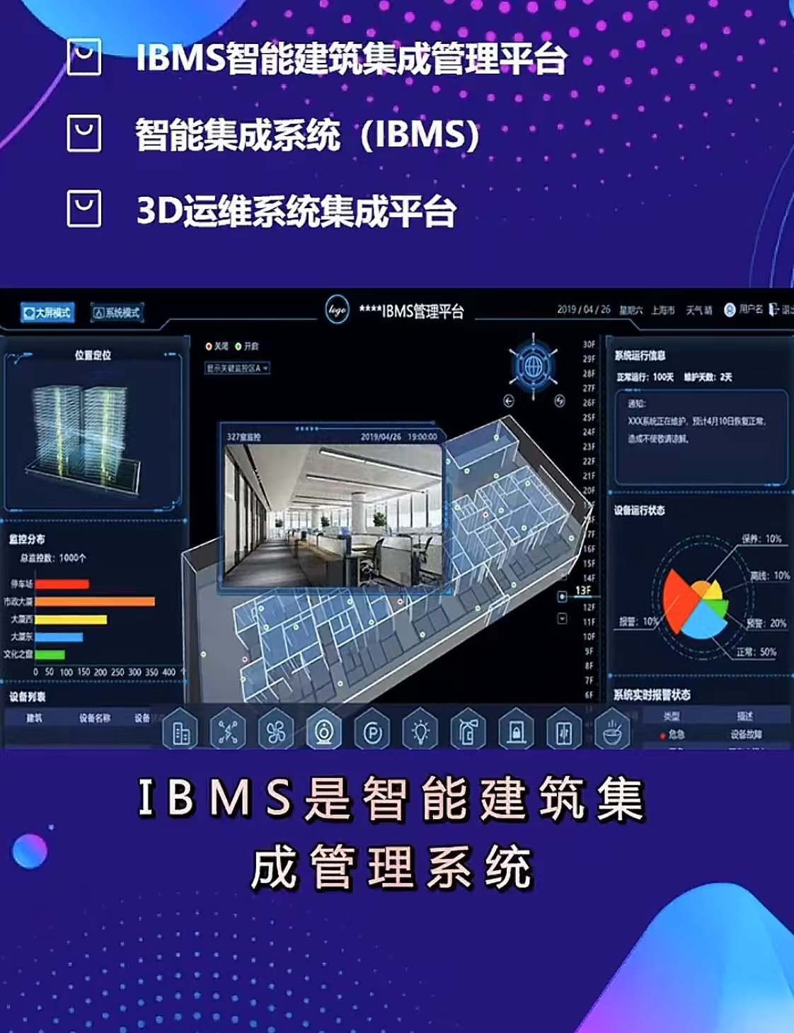 平台融合三维可视成果(BIM),在同一个平台内实现对不同子系统的集中管理与控制,平合不仅是对各个子系统简单的功能叠加而且还是对各子系统功能的补充和圹系。包括但不限于对安防管理、多媒体管理、语音通讯管理、能效监测管理、楼宇自控管理、机电专业自控系统、火灾监测消防监控,应急指挥现场调度、停车管理、门禁管理、信息发布、后勤运营等进行