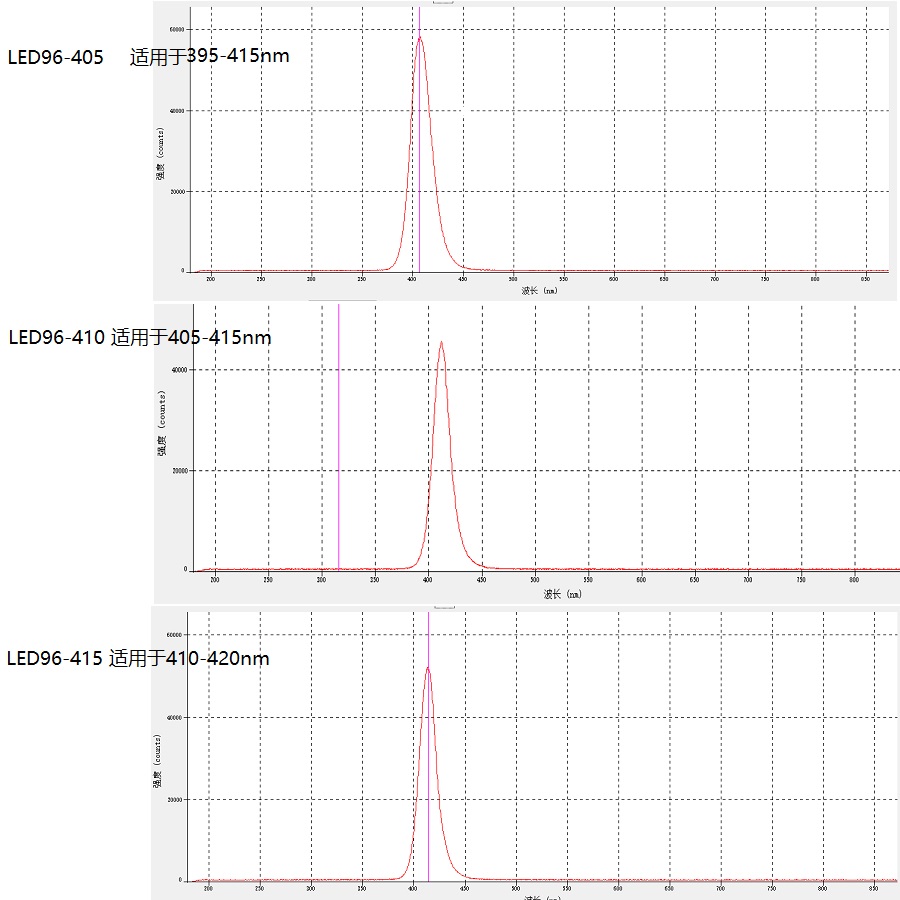 365nm、369nm, 395nm,405nm、410nm、415nm、420nm, 440nm、450nm、458nm青、465nm,488nm、500nm、520nm,550nm、590nm,593nm、620nm,635nm,660nm,740nm、808nm,850nm、940nm白光 ,可见光,(常用半峰宽+-10nm,比如465nm适用于455-475nm); |