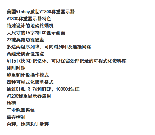 VT300电子称重仪表也叫称重显示控制仪表,顾名思义就是对载重物的重量进行称重显示,将来自传感器的感应找那个量值转变为阿拉巴数字进行显示,最后被工作人员所识别。称重仪表VT300-S-8-2-4-0-E也可以对工业企业的一些类生产产品的重量数值进行储存、统计等在计算机中,实现工业企业的电子化管理。VT300的安装应选的环境一定要在通风干燥的位置,如果在南方梅雨季节,VT300-S-8-2-4-0-E称重显示控制器就不适合安装在存在漏风漏雨的工地室内。另外称重显示控制器VT300-S-8-2-4-0-E在安装好后不要经常性移动,若在矿场要进行移动,必须要找专业的安装师傅,切不可自行拆线,否则会导致电线脱落产生后期故障。