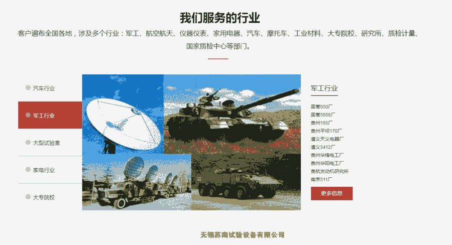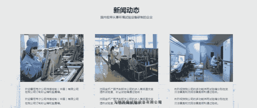 公司主导产品:汽车环境仓、汽车环境舱、汽车整车环境试验室、汽车低温冷启动试验室、汽车空调环境试验室、汽车淋雨试验室、汽车淋雨房、固化炉、盐雾腐蚀试验箱、高低温交变湿热试验箱、淋雨试验箱、砂尘试验箱、臭氧老化试验箱、步入式盐雾试验室、步入式高低温试验室、步入式淋雨室、步入式砂尘试验室、氙灯耐气候试验室等相关试验系列,客户遍布全国各地,涉及多个行业:仪器仪表、家用电器、汽车、摩托车、工业材料、大专院校、研究所、质检计量、国家质检中心等部门。主要用户如:兵器部轻武器检测中心、总装备部汽车试验场、国家飞机材料检测中心、中国飞机强度研究所、、兵器部201所、203所、204所、207所、208所电子4所、36所、22所、53所、中船722所、704所、723所、725所、中国航空总公司第605所、611所、613所、湖北江山工业集团公司、海南汽车研究所、中国汽车工程研究院、国家汽车材料产品质检所、国家汽车灯具质检中心、奇瑞汽车、东风本田、上海大众、法雷奥车灯、上海海拉电子、中国重汽集团、中国电力院、东洋机电、联想,华硕,科龙、华宝、威力、惠尔浦、美的、华凌、东宝、汇丰、春兰、美菱、荣事达、 博西威、无锡松下冷机,中意、万和、格力、海信、海尔、奥柯玛、新飞、康佳、奥克斯、新科、上菱天安、风华以及小家电企业:万和、格兰仕,康宝,神州,苏泊尔,帅康、华帝;外资厂商如:西门子、LG、松下、夏普、三星、比亚迪、上海华普,天津汽研所、东南汽车、长丰汽车、江西昌铃汽车、济南重卡、春兰汽车、浙江嘉利、镇江汽车制造厂、广州客车厂、海南马自达、北京福田汽车、北京欧曼重型汽车、浙江毫情汽车、天津一汽夏利汽车股份、聊城中通客车,北京海拉车灯、天盛车灯、秦川车灯/西门子威迪欧汽车电子、台州轩金车灯、武汉法雷奥、上海法雷奥、河南鹤壁天海电器、沈阳华晨、沈阳天海电装,重庆长华、烟台霍富锁厂、北京北重、襄樊达安汽车检测中心、秦皇岛戴卡轮毂、三门峡戴卡、无锡戴卡、南海中南轮毂、、沈阳三花轮毂、宁波跃进汽车、采埃孚富奥底盘、总装备汽车试验场、重庆中南铝合金轮毂、北京佩特来电器、大连柴油机,玉林柴油机,无锡柴油机,新昌柴油机,常州柴油机厂。