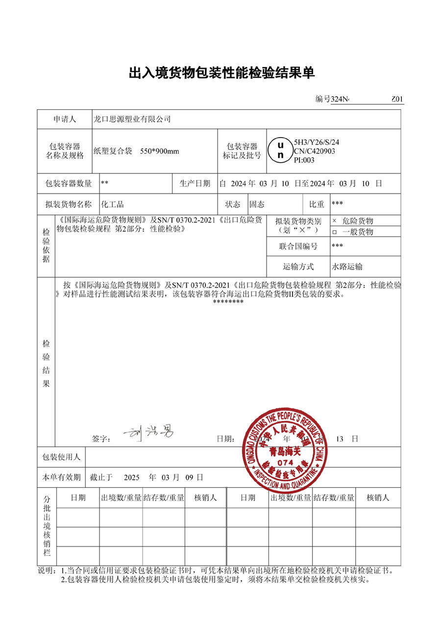 龙口思源塑业有限公司主营吨袋、纸塑复合袋、复合编织袋、塑料袋、纯牛皮纸袋。公司取得食品包装、危险品包装全国工业产品生产许可证,并由烟台龙口市出入境检验检疫局颁发“出口危险货物包装生产企业分级”、“出口食品包装备案书”,可以出具危险品、食品包装性能证。公司能私人定制化工出口危险品包装袋,提供危包出口性能单,危包出口商检单,危包生产许可证等,满足客户出口和内销需求。选化工出口包装袋,我们可帮您私人定制。