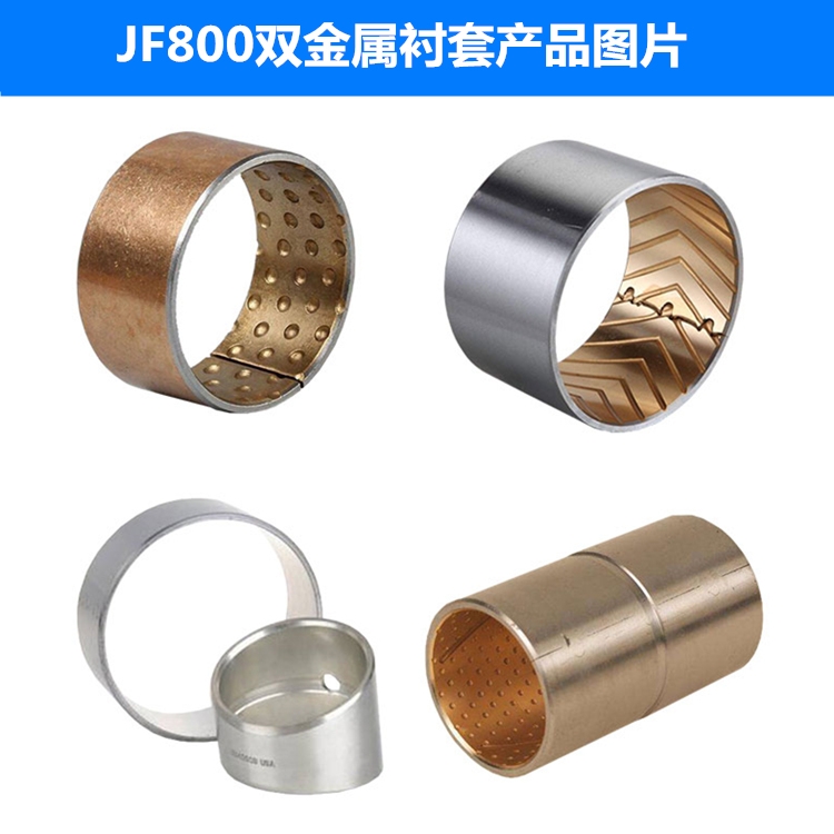 自润滑双金属无油轴承JF800滑动轴承衬套以优质低碳钢为基体,表面烧结具有低摩擦特性的铜合金(CuPb10Sn10、CuPb6Sn6Zn3、CuPb24Sn4、CuPb30、AlSn20Cu、CuSn8Ni)作为轴承的耐磨层,铜合金表面可以根据使用工况需要加工出各种类型的油槽、油孔、油穴等,以适合于无法持续加油或者难以加油的场合。材料通过二次烧结二次挤压可以得到较好的接合强度和较佳的承载能力。