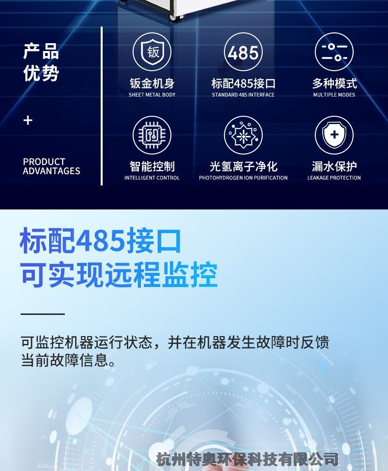 水箱设计采用人工加水和自动进水相结合方式,一旦漏水,排水口会自动排除多余水分,机器显示故障报警。(高端配置)消毒机采用光谱氧化净化装置,迅速净化空气中的细菌、病毒。 采用独特浸渍的气体过滤器,高效净化甲醛、苯、氮氧化物等多种有害气体。。 产生负离子,消除人体疲劳。