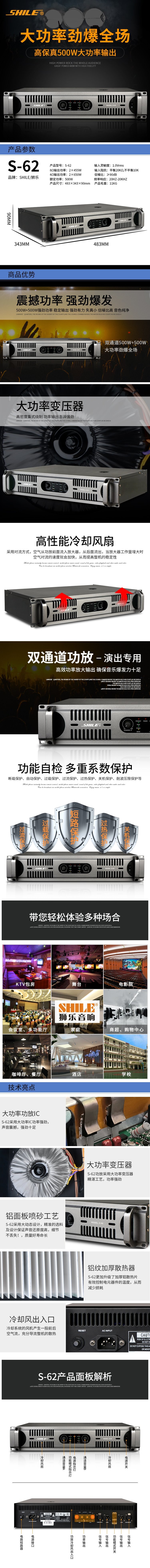 SHILE/狮乐 S-62 大功率后级功放 高保真500W大功率输出 专业纯后级 品牌 | SHILE/狮乐 | ||