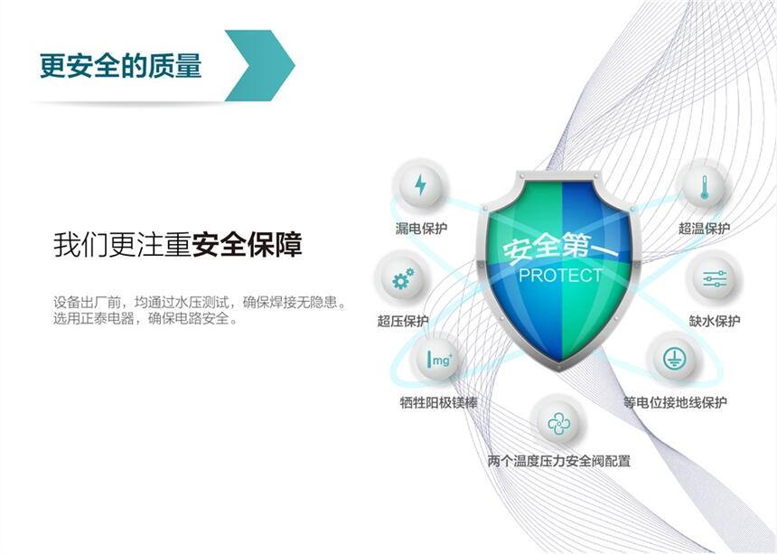 5.安全性能:每台电热水器都有非常可靠的接地线系统。每组电热元件均配置了380V漏电断路器。每台热水器均配有压力控制系统和热水器专用的T/P温度压力安全阀,以防止水压过大或温度过高而造成的内胆损坏。
