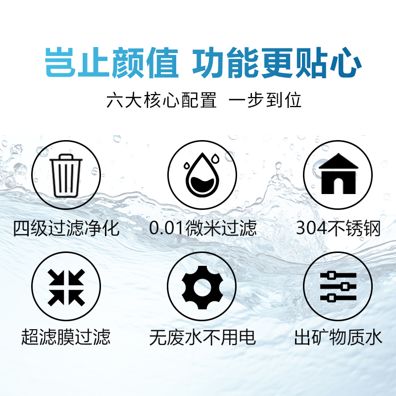 过滤工艺:PP+UDF+UF+UV 适用压力范围:0.1-0.5Mpa 进出水纯不锈钢材质,UV定制款 无盐防垢阻垢,无外置压力桶 通用滤芯设置,方便售后及维保 大通量,可直连家用龙头