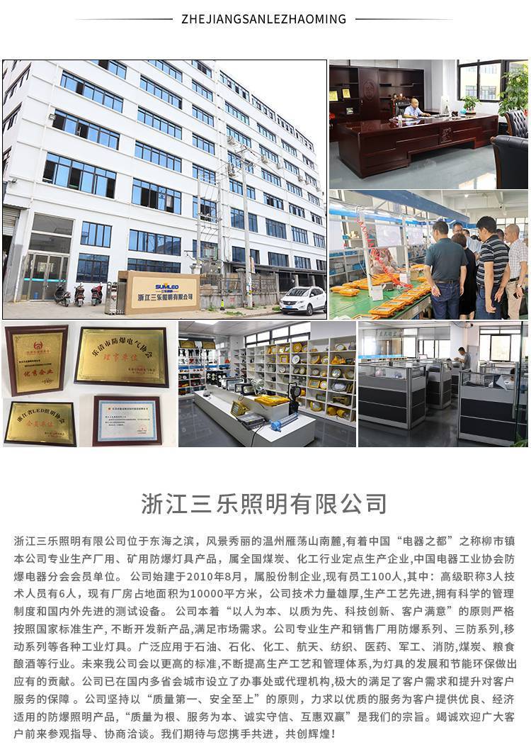 浙江三乐照明有限公司位于东海之滨,风景秀丽的温州雁荡山麓中国电器之都”浙江东清市柳市镇创始于2010年 从事煤矿、石油、化工、舶泊、铁路、电力、等特种防爆照明、固定式 照明、移动式应急照明系列产品的研发、制造销售和服务