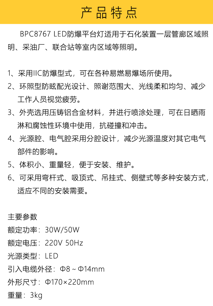 使用环境 | 石化装置一层管廊区域照明、采油厂、联合站等 | ||