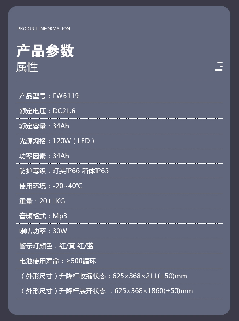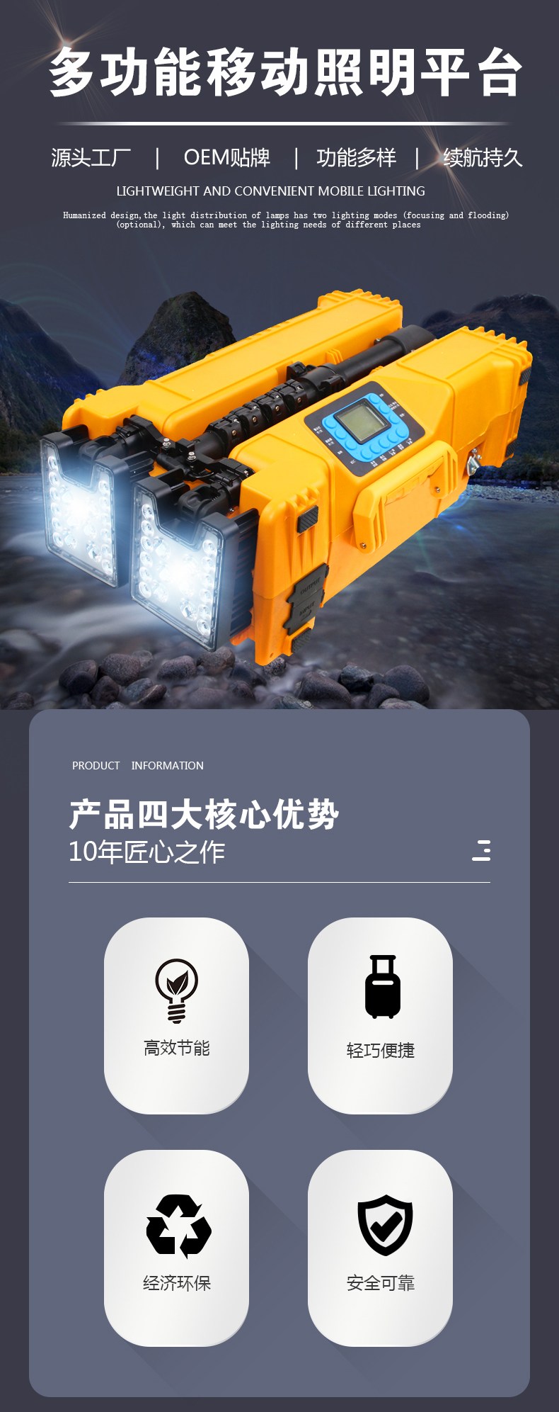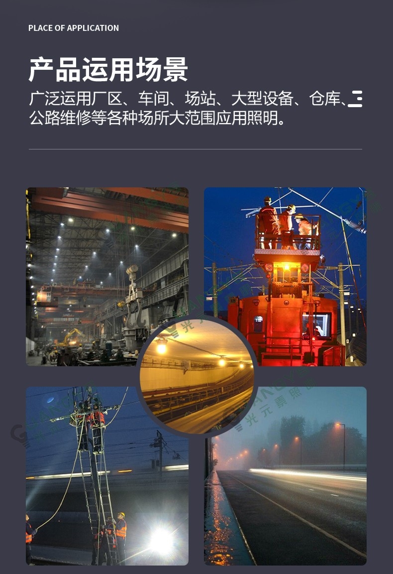 ●灯具采用大容量高能锂电池,照明功率120W,可满足客户施工现场大范围照明需求;