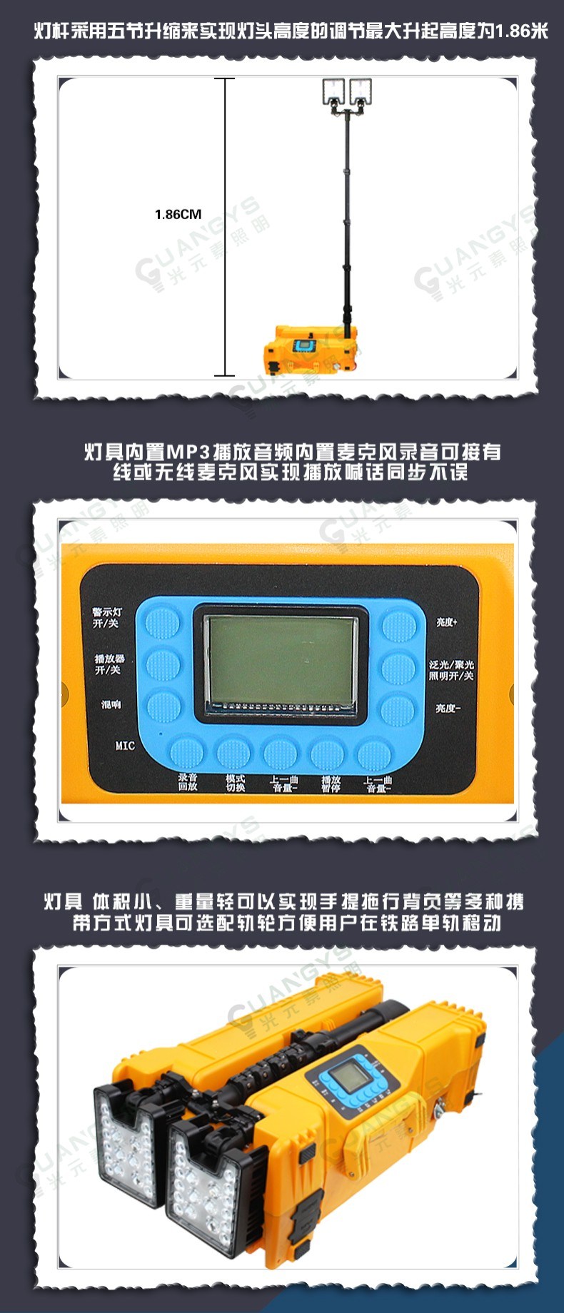 ●灯杆采用五节升缩来实现灯头高度的调节,最大升起高度为1.86米;