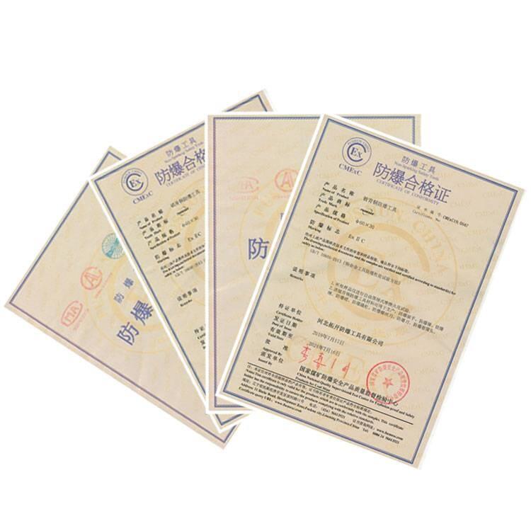 材质:铝青铜、铍青铜 铝青铜材质,工作面硬度HRC25°以上,抗拉强不低于δ b 75-85kgf/mm2属国家ⅡB级产品,在浓度7.8%的乙烯气体中作业不引爆气体; 铍青铜材质,工作面硬度HRC35°以上,抗拉强度δ b>105-120kgf/mm2,属国家ⅡC级产品,在浓度21%的氢气中作业不引爆气体;铍铜合金防爆工具还具备特殊的防磁功能,在有磁场的工作环境中能够正常使用。 以上两种材质防爆工具能有效的防止工具与工作物相互摩擦、撞击时产生的可燃性爆炸,确保国家财产和人身安全! 适用场所:石油、化工、矿山、防恐怖、防磁场、煤矿、采气、油气管道、发电、冶金、军工、航空、储运、制药、制气、塑料、化纤、皮革、烟火、爆竹等