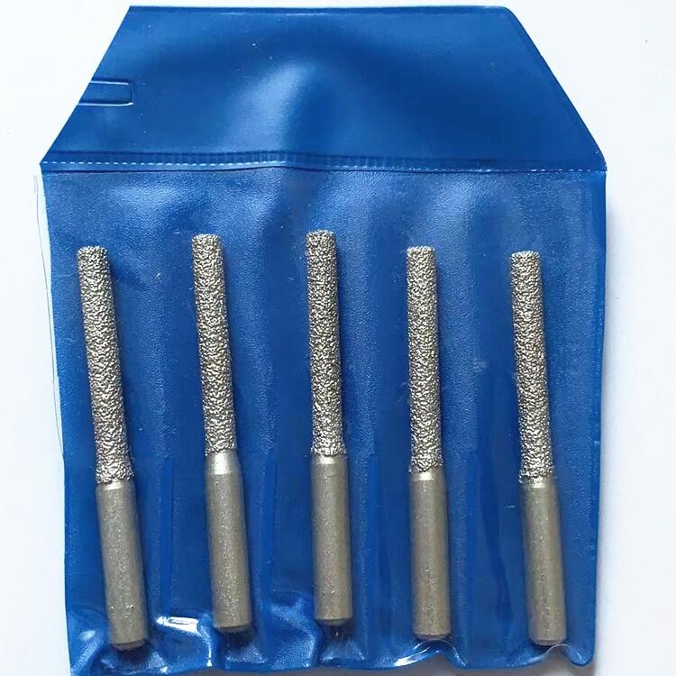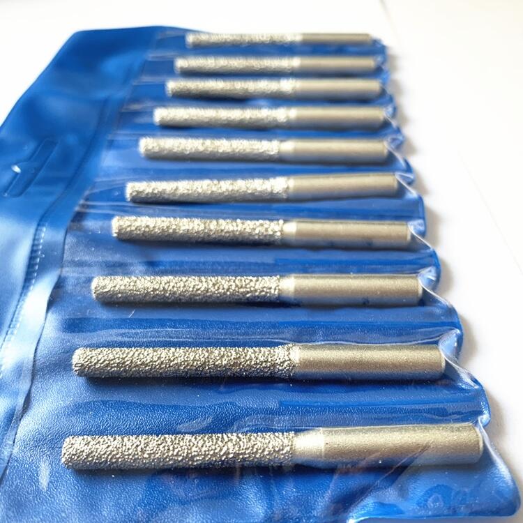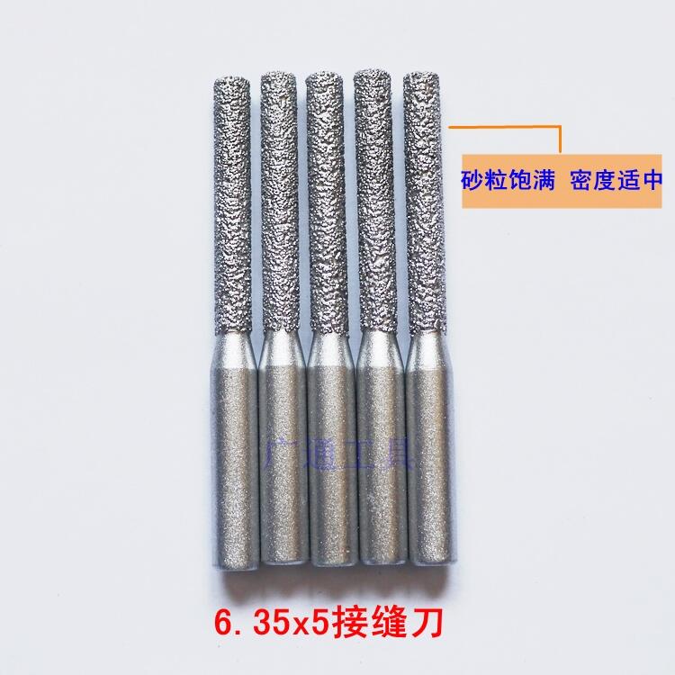 钎焊金刚石拼缝刀头可以用于大理石、石英石、岩板的接缝,主要用于小修边机上,石英石岩板拼缝刀头的规格是柄径6.35mm,磨头直径5mm,总长65mm,砂长35mm,可以用于小修边机上各种石材的拼缝加工。