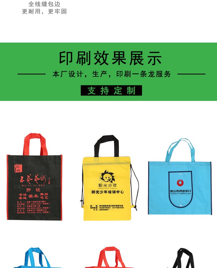 昆明霆尊商贸有限公司,前身是专业的袋子制作工厂,于2010年初成立专业的销售公司。公司集设计、生产、销售为一体,专业为企业定做无纺布袋,环保袋,复膜广告袋,手提袋,帆布袋,牛津袋,西服套,T恤、文化衫、广告衫、围裙、广告围裙、各种布料的围裙。公司的产品以车缝,超声波热压为主,月产三十万只左右的袋子。 公司秉承“质量为本,诚信双赢”的企业理念,为广大客户提供优质的产品,快捷周到的服务。 公司产品款式多种,色彩丰富,可以为客户提供丝印、胶印、烫画、热转移印、刺绣等多种广告工艺效果。