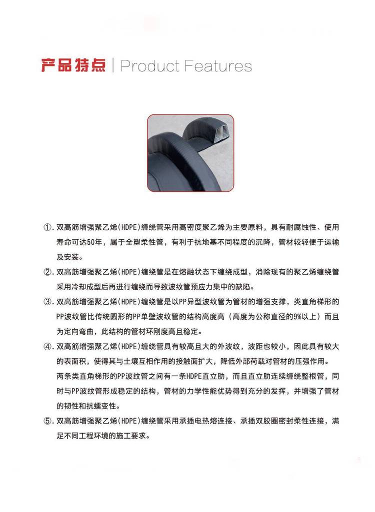 1、双高筋增强聚乙烯(HDPE)缠绕管采用熔融的热态缠绕工艺,觖决了其他聚乙烯缠绕管采用水冷弯曲缠绕工艺无法