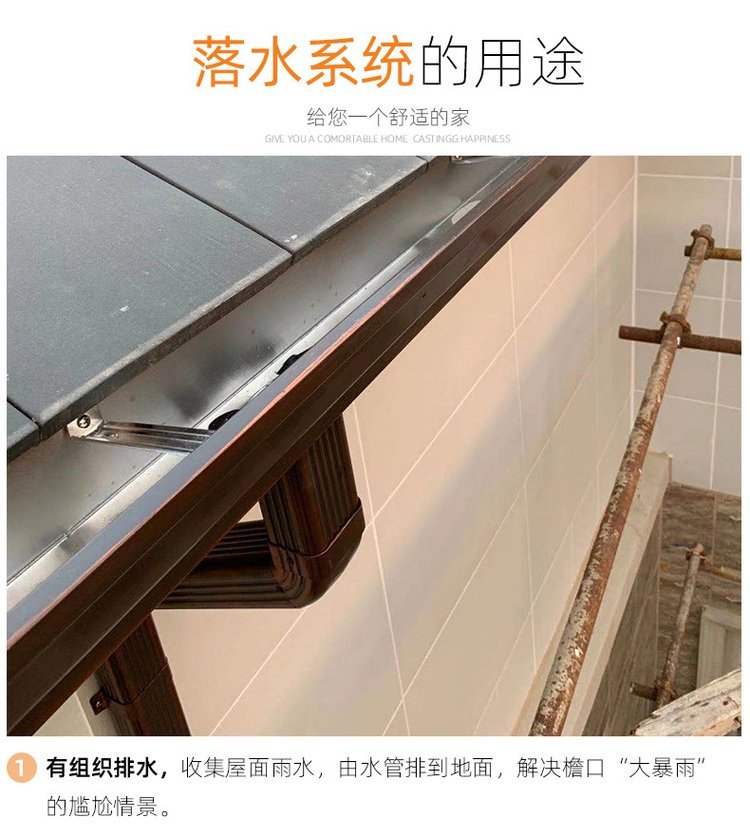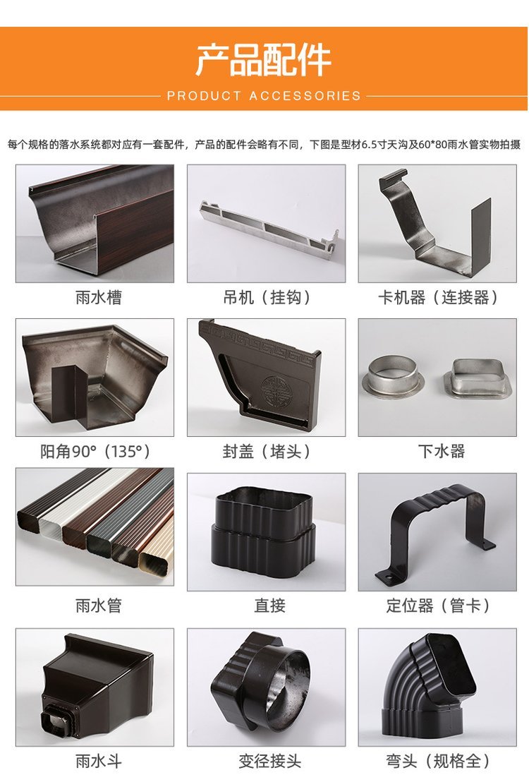 金属彩铝表面会形成一层肉眼看不见的氧化膜,使铝不再氧化,这种自我保护使铝具有极高的耐腐性;其次铝合金基材表面覆以彩色聚脂涂层,色泽稳定;第三铝合金热胀系数和水泥基层的系数接近,不会再彩铝落水系统使用后,造成涨起和裂缝,导致漏水 铝合金雨水系列产品设计合理,铝合金片采基本不会同的厂家、不同的厚度来做设计,并配以风道,确保铝合金片的密封性。产品设计合理,产品设计合理的铝合金雨水系列产品,做产品标识化工艺,遮挡铝合金阳面的出口牌