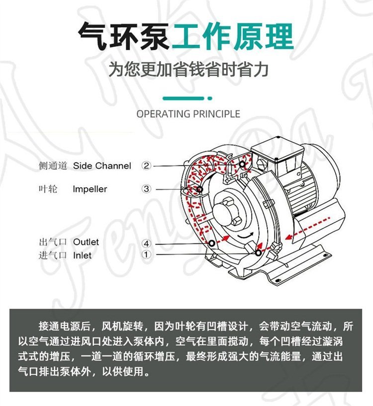 工作原理 | 通过叶轮凹槽设计带动空气流动,经过漩涡式增压形成强大气流 | ||