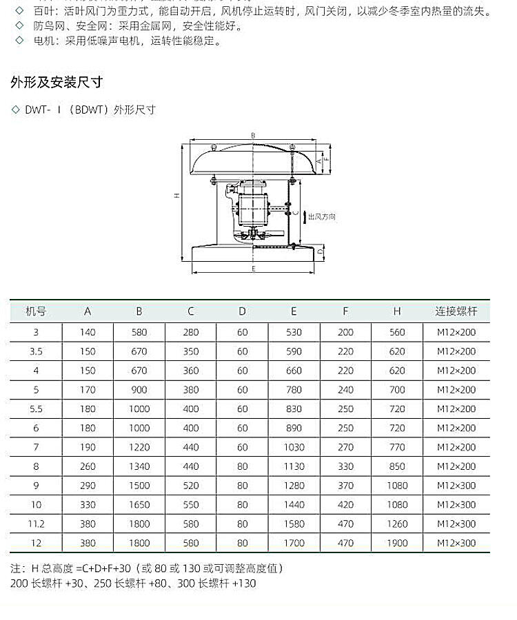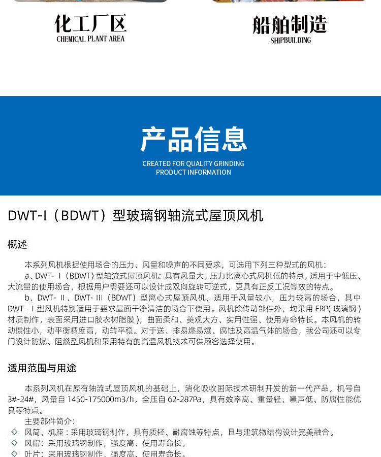 及风量、压力和噪音的不同要求选用。DWT系列风机采用模压轴流或离心叶轮,风机由叶轮、风筒、风帽、传动部件活页风门、安全网等部件组成。具有耐腐蚀、质轻高强、运转平稳、维护简单、噪声低、性能优等特点,广泛应用于发电、化工、橡胶、制药、食品加工、治金、中低压、大流量场合等各行各业及民用建筑的通风换气。DWT型采用宽叶片、大弦长空间扭曲倾斜式轴流叶轮,适用于中低压、大流量场合的通风换气。根据不同的使用环境和输送介质,叶轮可采用铝合金、钢板、工程塑料、玻璃钢等材质制作,制成常规型、防腐型、防爆型、防腐防爆型。