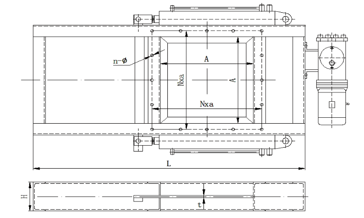 该闸门结构简单,重量轻,操作灵活,装拆方便,采用碳素钢制造,其强度高,性能好,使用寿命长;丝杆及螺母采用了软防护罩结构,不受外界粉尘影响。