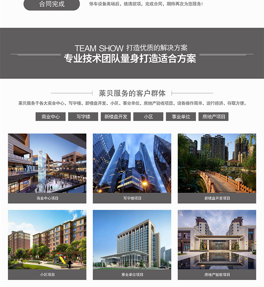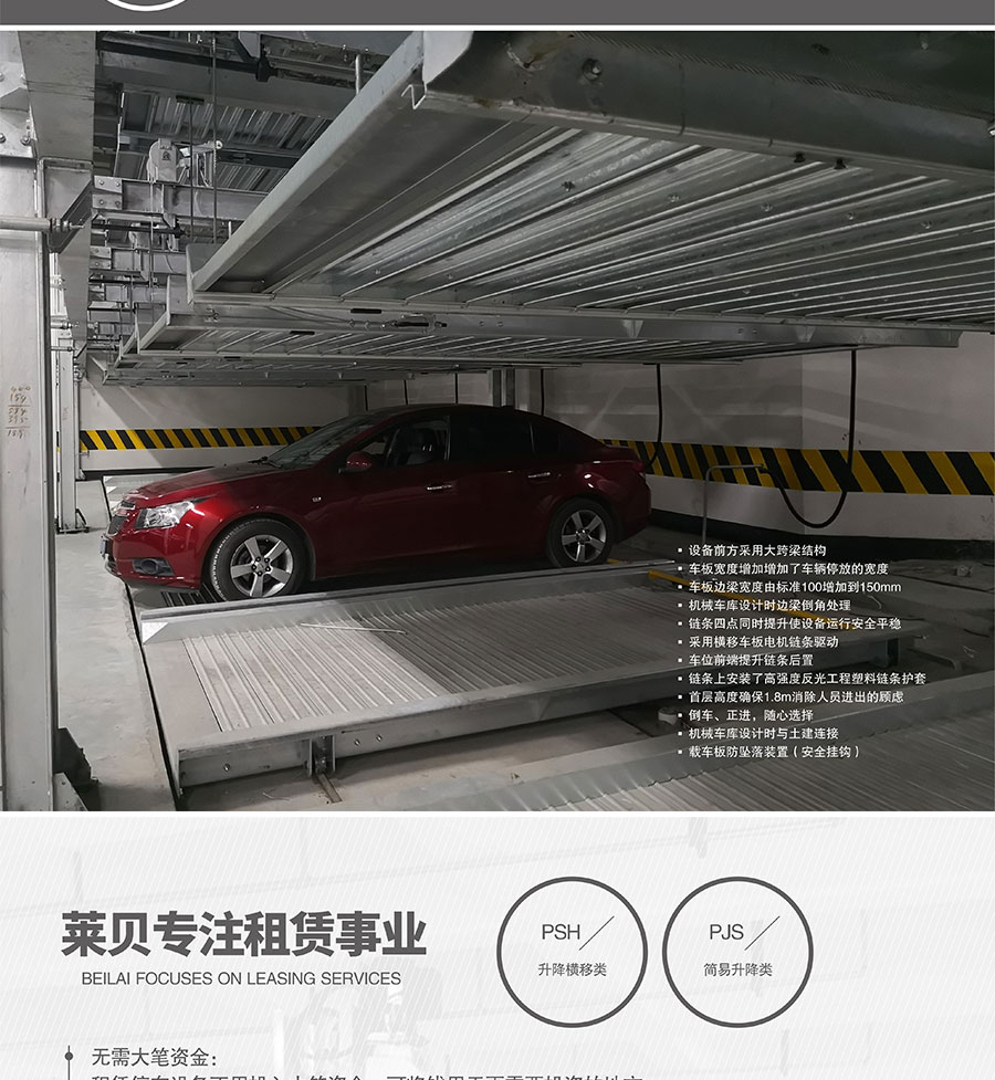 公司与多家机构、设备制造商、服务团队、停车管理等多家企业形成战略合作关系,抓住历史机遇,在尽可能短的时间内,做大做强做牌。不断设计并优化停车场方案,为客户提供多元化的立体停车场经营以及技术支持服务,致力于成为国内立体停车场经营提供商。为了响应快速发展的停车需求和引入社会资源优化停车产业结构的号召,莱贝停车设备配合政策,解决城市停车难题,将未来停车产业推向新的领域。公司利用人才、技术和设备优势,租赁一系列适合国情的产品。主要有:陕西省黄龙立体车库租、二柱机械车库回收、机械立体车位过验收出、简易升降式、升降横移升降式等。该产品具有占地面积少、空间利用率高、安装方便、能耗低、噪音小等特点,适用于各种场地和建设要求。公司为客户提供立体车库规划计划、施工设计、安装调试、运营培训、技术支持、机械停车设备销售、租赁、回收等多项服务。