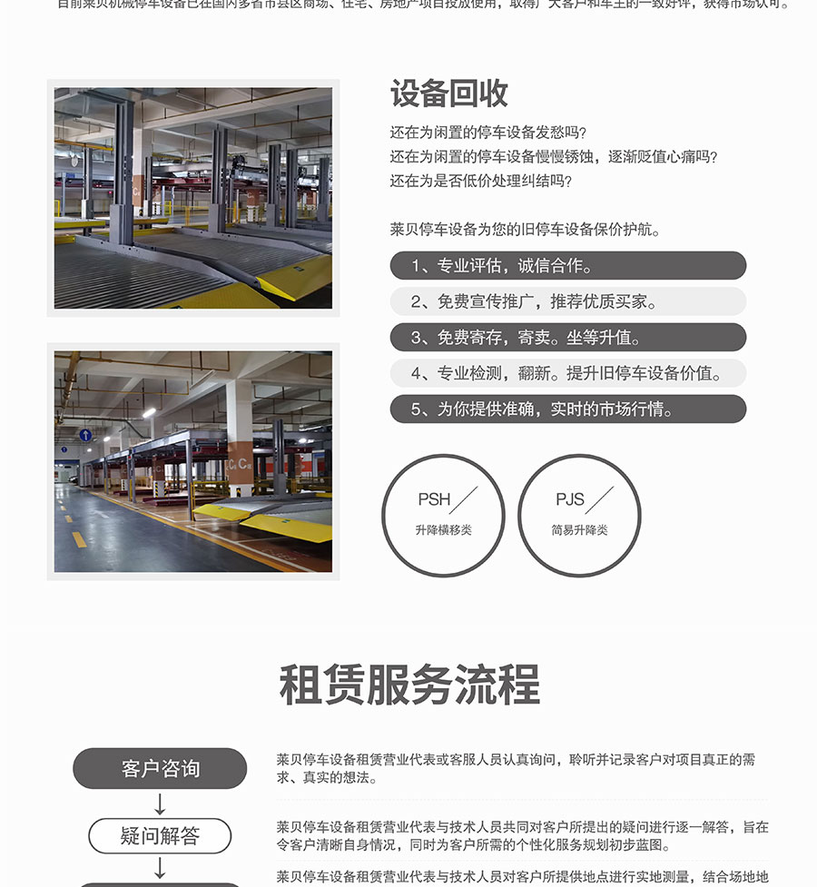 四川莱贝停车设备有限公司致力于立体车库租、二柱机械车库回收、机械立体车位过验收出、机械停车设备销售、机械式立体车库设备经营租赁、立体停车场建设、停车场经营管理、停车场规划设计、停车场施工建设、共享停车、盘活停车场、收购停车场、租赁停车场、收购停车位、出售停车位、停车资产管理及互联网停车软件开发车主服务等领域。我们为机场、车站、商场、大学、住宅、酒店、p r停车等各种停车类型,从一个停车场一个区域到一个城市提供停车位经营解决方案。公司严格按照iso9001:2015质量管理体系、iso14001:2015环境管理体系、iso45001:2018职业健康管理体系要求,优化组织架构,规范内控体系,明确部门分工,积极开拓市场。业务特色鲜明,在市场营销、风险控制、人力资源管理等方面均衡发展,形成覆盖全国的业务网络,建立了科学的管理模式。