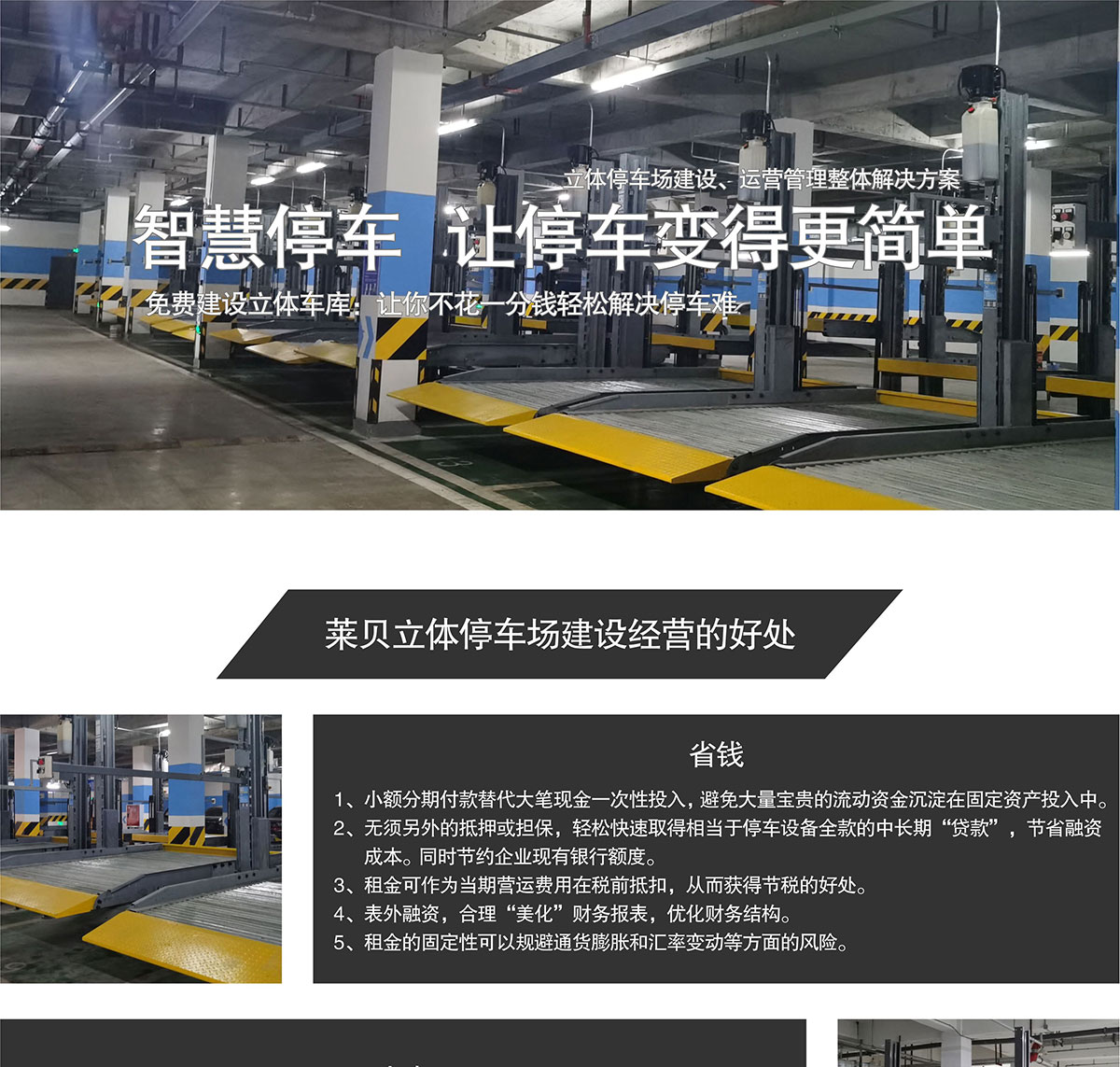 莱贝主营立体车位租赁 两柱立体停车 机械车库租用。安装装置(1)防坠装置:搬运器或载车板运行后处于空中静态位置时坠落的装置。(2)自动门防夹装置:当自动门在关闭的过程中有汽车或障碍物出入门时自动停止或自动开启的安全保护装置。(3)安全钳:搬运器在下降时,制动并控制搬运器使其停止运行的机械装置。(4)限速器:当搬运器的运行速度额定速度值时,其动作能导致安全钳起作用的安全装置。(5)装置:在搬运器或载车板上沿汽车行进方向设置的起阻挡车轮作用的装置。(6)人车误入检测装置:在停车设备出入口处,设置的用于设备运行时检测人员或汽车误入停车设备的保护装置。(7)缓冲器:位于行程端部,用于吸收搬运器、平衡重、对重等动能的一种缓冲安全装置。(8)紧急停止开关:停车设备运行过程中能断开动力及控制电源使设备停止运行的开关。