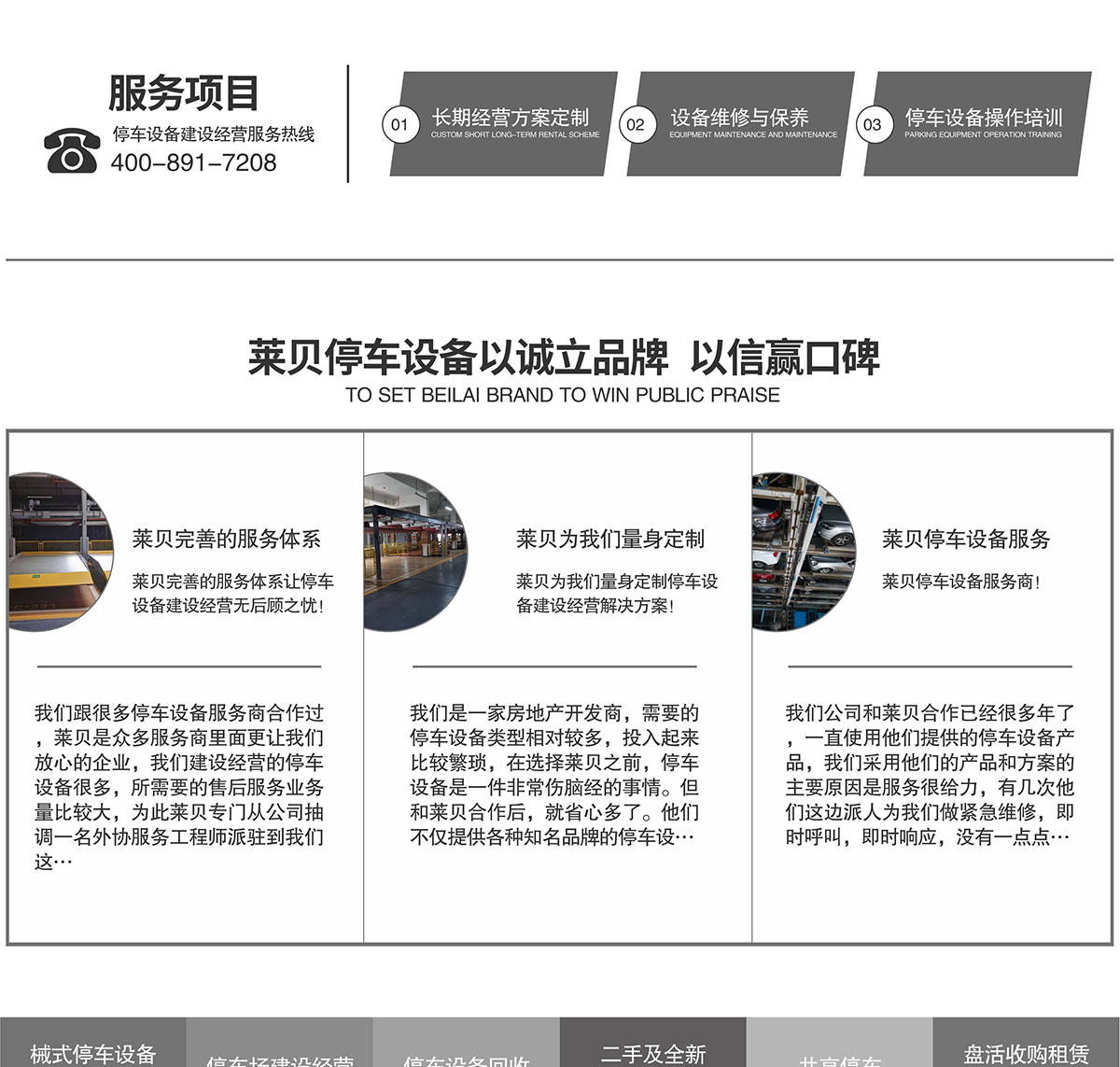 机械式立体车库的服务是一个新的增长点。的公司随着众多的机械式立体车库进入维护期,的市场商机吸引着的服务公司如雨后春笋般出现。一般立体车库的保费用为每车位每月30-100元不等。立体车库使用时间越长,服务的费用就越高。所以随着使用年限的增长,服务带来的商机将。与立体车库生产带来的不同,只要立体车库在正常使用过程中,它所带来的将会是不断的。透过服务本身,可以看到在设计过程中一些无法察觉到的缺陷或问题。在服务的过程中,可以帮助我们找出这些问题并反馈给产品设计人员。通过不断的反馈及完善,可以让我们的立体车库产品。做好立体车库的服务可以为生产企业带来更多的。的服务可以获得的用户使用体验,增加产品的美誉度及品度。如何做好立体车库的服务?是组织上的保障,成立的服务部门。为做好立体车库的服务工作,要有强有力的服务班子,有专人负责。其次是招聘的人员,利于且快速排除设备故障。当设备出现问题导致立体车库不能存取车时,且处于上下班高峰期,如果不能解决问题,会导致客户不满程度上升。的保人员可以加快响应的速度。再次是健全保人员的培训制度。立体车库的种类很多,是的立体车库维护,能够有能力从事这项工作的人员很少。通过学习和培训,可以是保人员快速掌握各种类型的立体车库知识,为打造的服务队伍打下基础。更后是做好立体车库的周期检查月。立体车库的维护周期可分为:日保、周保、月保、半年保、年保等。通过一段时间的积累,每个周期的维护内容逐渐固化,保持的,将会形成的。的服务不是一朝一夕能形成的,需要一个团队经过漫长的时间才能获得客户的。但是一旦获得客户的将不断的获得的。