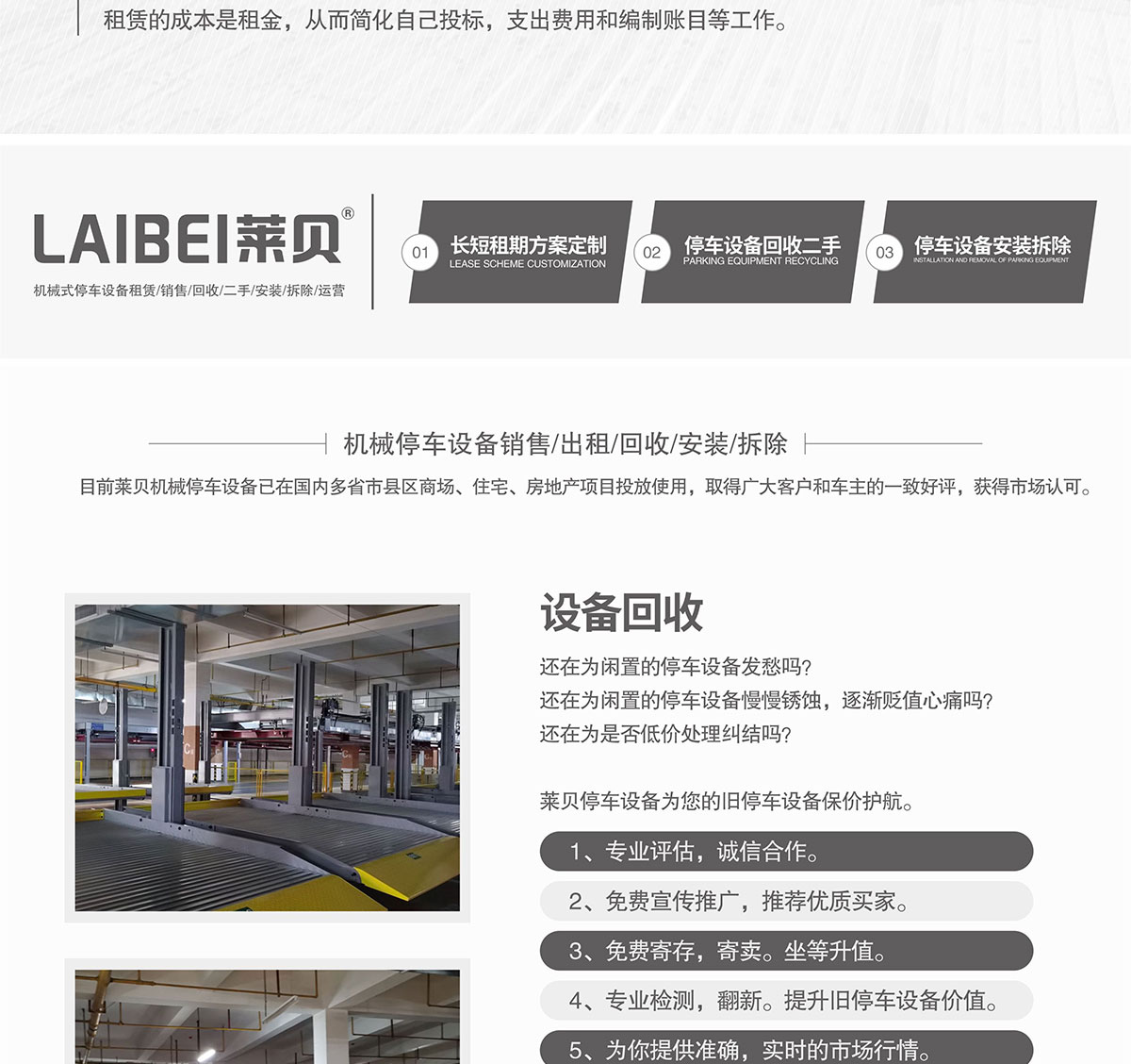 LAIBEI莱贝主要有:停车设备租赁、简易立体车位、机械停车安装等。“临时”是道路泊位重要的属性,而临时停车制度在国内任何一个城市都实施过,可以说,国内城市在道路停车管理方面一直在错误地走着。关于道路停车的管理,我们学到的国外经验只是表面,只是其中一个环节,只会单纯以收费手段管理道路泊位,既违背了道路泊位的临时属性,也容易招致民众的反对。正是因为道路泊位只有单纯的收费模式,很多人会提到保管责任。认为道路泊位有保管责任的人,是潜意识把道路泊位当成停车场了,这一点是错误的。关于这一点,我们的主管部门把正确的清晰地传递给民众:即道路泊位不是的停车场,它是用于临时停放的,它只是道路空间化利用的措施,它事实上是道路,所以谈不上保管的责任。想要保管,只能去路外的停车场,至于路外的停车场是否有保管责任,是另一个话题。4)总之,道路停车管理要强调,因为它是城市交通管理的重要环节。