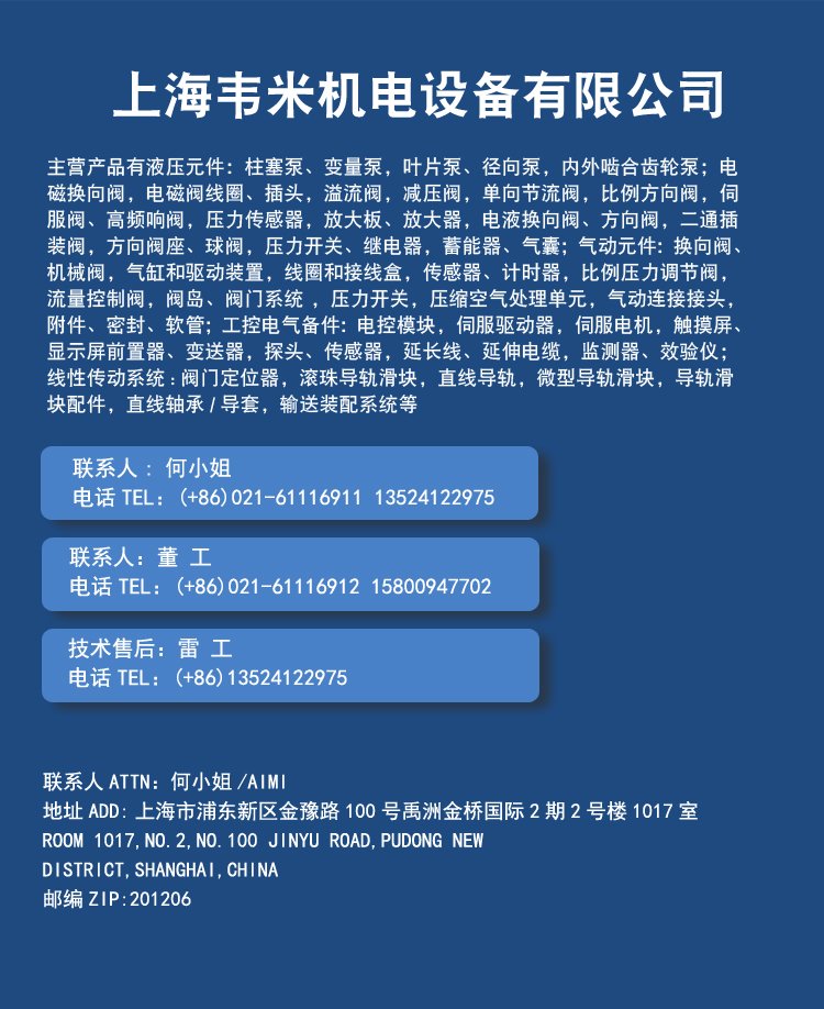 上海韦米机电设备有限公司位于上海市浦东新区金桥禹洲国际,是一家从事经营国外进口液压气动备件、自动化仪表的贸易型公司;专注于中国工业传动自动化流体领域。主营产品电磁阀、柱塞泵、数控模块、伺服电机、可编程控制器、传感器、气动元件、工业仪器仪表等。经营品牌有:博世力士乐rexroth、阿托斯ATOS、迪普马DUPLOMATIC、Parker派克、EATON VICKERS伊顿、贝加莱B&R、西门子Siemens低压、爱尔泰克Airtec气动等进口品牌。