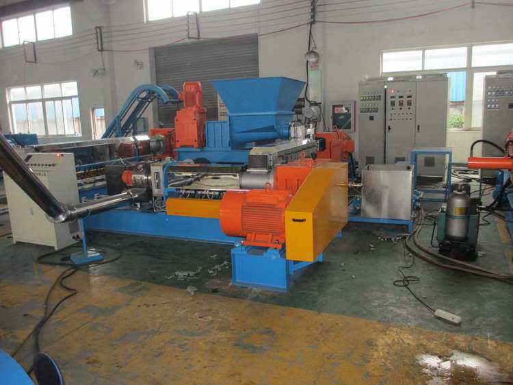 密炼机——自动提升机——推拉式锥双喂料机——双螺杆挤出机——单螺杆挤出机——液压板式自动换网——风冷模面热切造粒辅机——一级旋风分离器——二级旋风分离器----风冷振动筛(2.5m) ——风吹料仓一套