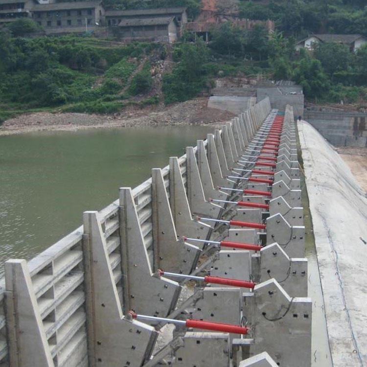 景观钢坝的启闭机采用了现在市面上使用较多的液压启闭机,闸门启闭灵活,美观实用。通过开启到适当的角度来形成人工瀑布的景观。本产品是对现有的结构钢坝结构的改进。通过在门叶的底边钢性链接设置的底轴,并在底轴的近两端连固诸如连杆或齿轮的传动件。在安装过程中,中间底轴的两端分别放置在支架中。 在相应的驱动装置的作用下,连杆摆动,或齿轮或扇形齿轮旋转,以驱动底轴在一定角度范围内不旋转,从而使门扇呈扇形运动 ,从而达到控制水位的目的。 该产品不仅可以在垂直大坝中蓄水,而且可以在水平大坝中泄洪。 它还可以利用流经坝顶的水来形成人工瀑布的景观效果。