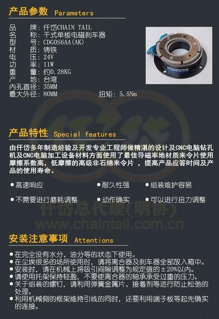 如需了解更多关于仟岱电磁刹车器CDG0S6AK批发【已认证】的详细资讯,欢迎来电咨询余先生13710967244,QQ:114776133,www.chaintail.com.cn。