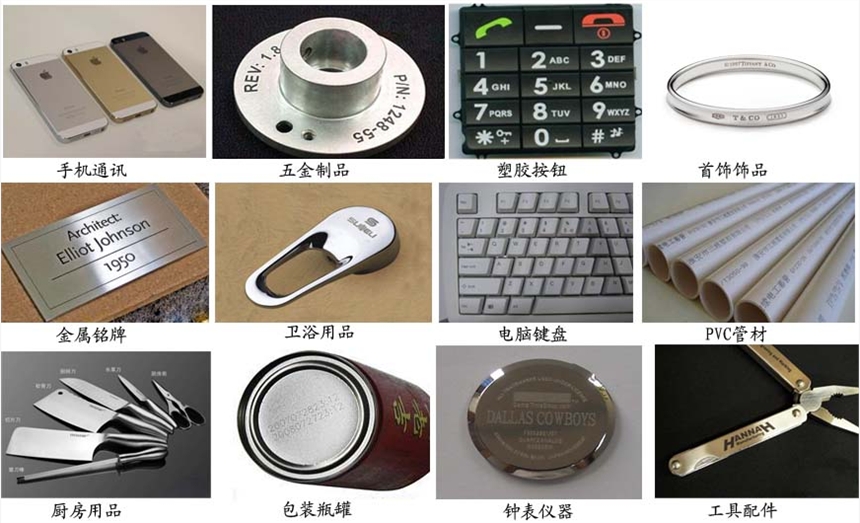 广泛应用于金属材料和部分非金属材料,特别适合一些要求更精细、精度更高和对光滑度要求较高的领域,广泛应用于电子学分离元器件、集成电路(IC)电工电路、手机通讯、精密器械、个性礼品定制、眼镜钟表、计算机键盘、首饰饰品、五金制品、厨具、工具配件、汽车配件、塑胶按钮、水暖配件、PVC管材、医疗器械、包装瓶罐、卫生洁具等众多领域图形和文字的标记,以及大批量生产线作业。