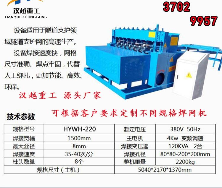 隧道钢筋焊网机主要是按照机型用途和焊接框架划分种类的,在一款机型有它特定的焊接范围,1.5米钢筋网焊网机就是这一案例,以网片宽度来定义名称,对于小批量的网片焊接可根据网片的尺寸情况采用常见的半自动排焊机柔性化机型多规格小批量,不同焊接工件选配合适的机型,已达到投资小、效率高的目的。汉越重工从生产实际出发,致力于提高效率,降低劳动强度,在立足独立自主的基础上,坚持改进、点滴积累、不断技术创新,用我们卓越的产品和服务来满足客户的需求!