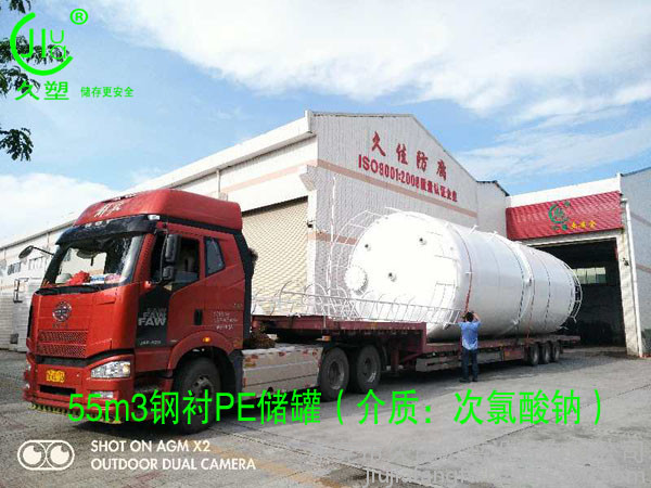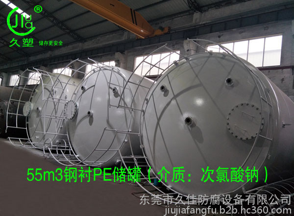 久塑牌钢衬聚乙烯储罐、次氯酸钠储罐是以聚乙烯(pe)为原料,采用旋塑工艺(滚塑技术)一次整体成型。将钢网焊接于钢体表面,使钢体表面、钢、网、塑复合形成一个整体,这种钢衬聚乙烯储罐既有高强度物理机械性能又有高强度耐化学腐蚀性能。钢衬塑产品一般由桶身、平底、封顶、人孔、进料口法兰、出料口法兰和液位孔口法兰组成,卧室钢衬聚乙烯储罐通常还有标准钢质支座。钢衬塑产品一般根据用户要求设计制造。产品整体滚衬塑层一次成型,无接缝、坚固耐用、卫生洁净、耐任何浓度硫酸、氢氟酸、盐酸、磷酸、稀硝酸、次氯酸钠溶液等、寿命长、绝缘好,且反应介质不会与金属离子接触。具有良好的耐腐蚀、耐磨损、寿命长等优点,是装运腐蚀液体的理想产品,在化工、稀土、冶金、农药等行业,用作85度以下的次氯酸钠储罐、低压罐、真空罐、反应釜、交换柱等,深受用户欢迎。