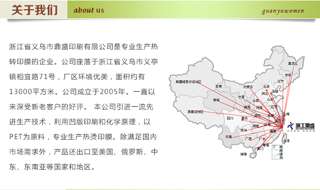 欢迎各界朋友莅临义乌市鼎盛印刷有限公司参观、指导和业务洽谈。义乌市鼎盛印刷有限公司,在未来将有更多样创新的转印材料陆续推进市场,转印膜价格,我们坚持优质诚信,更期待能为您提供称心满意的服务。