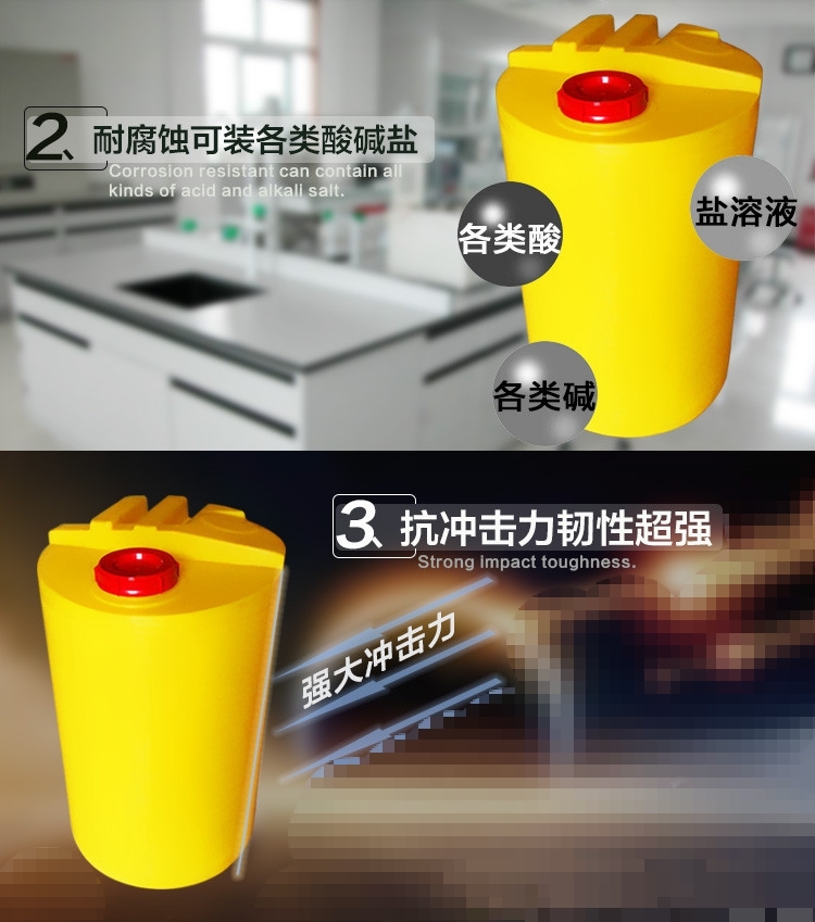 材质选用线性低密度聚乙烯,容量从60L到1000L,采用滚塑一次成型的制作工艺,无异味耐酸碱腐蚀,有较好的抗冲击能力及韧性。适用于水处理、环保、化工等。